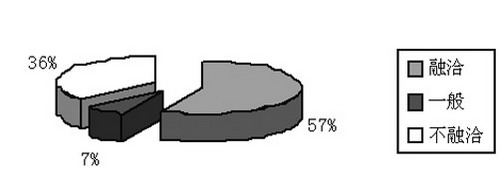 调查中,有28个个案反映,流动儿童与当地儿童的关系“不融洽”,占总体的36%;有6个个案反映流动儿童与当地儿童的关系“一般”,占总体的7%,以上共计34个,占43%。有43个个案显示,流动儿童与当地儿童的关系比较“融洽”,占57%。(见图1)