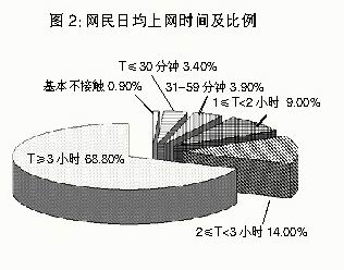 网络基础设施建设的不断完善,为网民上网提供了更为便利的条件,而网络应用的日益丰富,则吸引着网民花费更多的时间使用互联网。早在2 0 0 6 年,美国调研机构I p so s I n sig h t的一项调查就显示,中国网民平均每周在线时间达到17.9小时,位居全球首位,排在第二位的日本为13.9小时,美国仅有11.4小时。我们的调查结果显示,目前每天使用互联网超过3小时的网民占到国内网民总数的68.8%,另有23%的网民日均上网时间在1-3小时,而每日上网时间不足1小时的网民仅占网民总数的8.2%。
