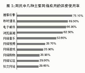 搜索引擎是互联网时代最具代表性的信息获取方式,也是国内网民使用最广泛的信息工具。我们的调查显示,搜索引擎目前在国内网民中的深度使用率达到75.1%,在全部24种网络应用形式中位居首位。