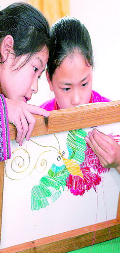 泗水小学在女童班办班过程中,选派有教学及管理经验的骨干教师负责女童班的教学管理和生活指导。根据少数民族妇女喜爱刺绣的传统,泗水小学女童班开展民族工艺刺绣课,使艺术教育与民族刺绣工艺融为一体,熏陶学生审美情趣,培养其创新意识。
