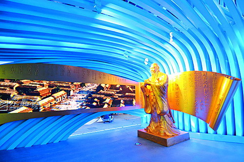 孔子像是山东馆的象征,也是中国馆的象征。孔子屹立于世博会,通过“孔德仁爱的文化胸怀铸造城市灵魂”的立意,契合“城市,让生活更美好”的世博会主题。整个展示中,和谐的理念逐渐递进,在主展厅达到高潮。孔子“和”的思想,体现了一个城市的灵魂,城市正是因为秉承了“和”的理念,才得以让生活更加美好。