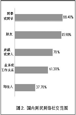 网民的虚拟社交网络很大程度上是其在现实世界中社交网络的移植。调查结果显示,网民进行网络社交的对象主要是其现实生活中的同事、同学、朋友、亲戚或家人,与这些人群进行网络交往的网民比例分别达到88.4%、85.9%、70%;排在其后的是与现实中有业务或工作关系者的网络交往,比例为61.3%;与陌生人交往的网民比例最低,仅占全部网民群体的37.7%。人们通过长期亲身接触而建立起来的现实社会关系具有一定的维系力。仅从目前国内情况来看,现实社会交际关系对网络社交的影响是非常显著的。网民主要的网络社交行为都发生在其现实交际圈内,通过网络与陌生人建立联系、拓展新社交网络的程度总体上较为有限。