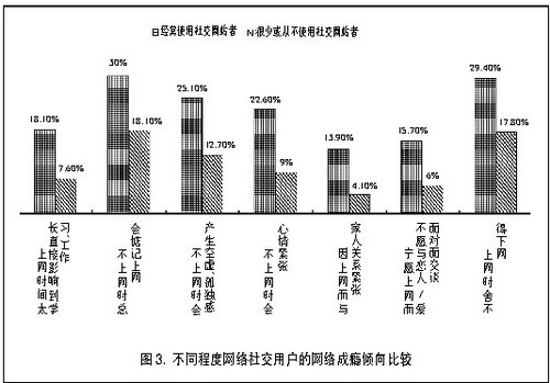 调查结果显示,目前国内网民的网络社交行为与网络成瘾之间存在显著的相关关系:网络社交工具使用越频繁、网络社交范围越广、程度越深者,网络成瘾的可能性和严重程度越大,超过限度的网络社交已经成为网络成瘾的重要诱因之一。调查发现,经常使用社交类网站的网民中,由于上网时间太长而直接影响到学习、工作的比例高达18.1%,而在很少或从不使用社交类网站的网民中,该比例只有7.6%;经常使用社交类网站的网民中,不上网时总会惦记上网的比例达到30%,而在很少或从不使用社交类网站的网民中,该比例只有18.1%;经常使用社交类网站的网民中,不上网时会产生空虚、孤独感的比例达到25.1%,而在很少或从不使用社交类网站的网民中,该比例只有12.7%。可见,相比轻度网络社交人群,重度网络社交人群无论在心理依赖还是现实社会生活所受影响的程度方面,均表现出更加严重的网络成瘾倾向。
