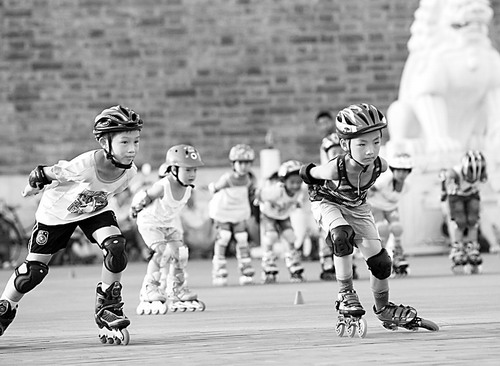 暑期,北京永定门城楼下,一群小朋友在老师的辅导下认真练习轮滑的简单动作。现在轮滑已成为广大青少年喜爱的健身活动,有的中小学还把轮滑运动纳入到体育课中。本报记者高腾摄