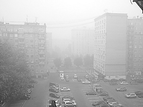 据悉,莫斯科各机场已经有许多航班因烟尘影响而不能按时执行航班任务。图为记者住所的窗外烟尘弥漫。