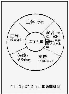 培养照顾好留守儿童,是一项长期、复杂、艰巨的任务,是一项系统工程,必须改变当前妇联、共青团、学校、慈善企业等各自为战、多头参与而形成的“零敲碎打”式的格局,改变关爱留守儿童活动中的“运动式”、“一阵风”,更多强调社会影响、较少关注实际效果的短期行为模式。在调动社会资金改善留守儿童学习生活条件和校园文化环境的同时,建立“以学校为主体+教育行政部门为主导、党委政府提供政策法规保障、公司企业提供资金支持+家庭、高校、卫生、军事国防、新闻媒体等协调配合”的“1+3+X”留守儿童培养新机制。通过调动各方积极性,整合社会力量和资源参与留守儿童培养,形成城市反哺农村、推进城乡统筹协调发展的留守儿童培养长效机制。