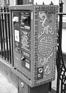 在英国利物浦的唐人街上,每一样公共设施都显露着中国风格。这是一个停车的收费机,与英国其他千千万万个收费机不同的是,它也穿上了漂亮的“唐装”。(《环球时报》4.7)