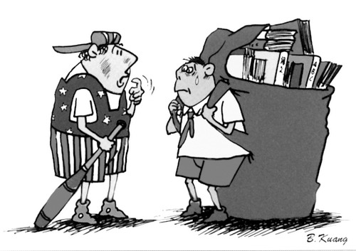 他给老师看儿子在中国读的四年级的小学课本,老师告诉他,到六年级他的儿子都不用再学数学了。他当时就后悔了,把儿子带到美国耽误了学业。在中国,小学生的书包都是沉甸甸的透着知识的分量,再看儿子,每天背着空空的书包,还高高兴兴地上学放学,一个学期眨眼就过去了,他不免心虚,问儿子,来美国上学印象最深的是什么,儿子回答:“自由。”