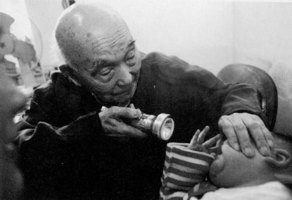 山崎宏大夫白眉毛长长的,遮住了一对小眯缝眼。102岁的寿星,患有白内障,耳朵也聋得厉害,和患者交流,完全依赖经验。他拿起听诊器搁在一个小儿的胸口,告诉孩子的奶奶,“嗓子呼噜呼噜的,感冒了。”孩子的奶奶说:“我小时候就是山大夫给我看病,我的孩子也是找他,现在轮到了我的孙子。”