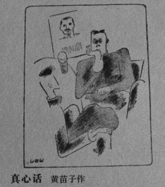 这一篇文章的目的是什么呢?还是先来看漫画《真心话》。黄苗子画的是小记者在采访要人秘书。墙上挂着一幅人像,其下有文字,歪挂着。似乎是孙中山遗像和其遗嘱。秘书坐着,一副官架子。漫画有文字说明: