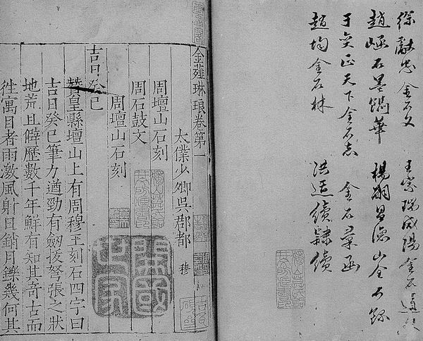 明嘉靖年间刻的《金薤琳琅》,流传不多,现在只有国家图书馆、上海图书馆、北京文物局藏有该版,比较稀见,更难得的是上面的题记。批字最重要的是叶树廉。叶家是一个比较大的藏书世家,宋代开始叶梦得是宋代有详录的最早的藏书家了,叶树廉是他的后人,在清初也是名气极大的藏书家。清代孙从添的《藏书纪要》说“余见叶树廉藏本校对精研,钱遵王虽装帧豪华不及其也”。钱遵王是藏书大家,钱谦益的族孙,钱谦益把自己的旧藏全部转赠给了他,再加上他自己的藏书,在清代是数一数二的人物。即使如此,孙从添认为叶树廉比他高,讲校勘精整还是叶树廉。叶树廉去世之后,他的书大部分都归了孙从添。有这样一个递传,他才对叶树廉有较深的认识和研究。