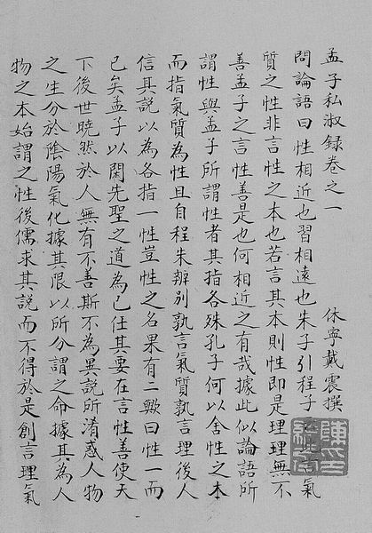 抄本《孟子私淑录》的着眼点有两个:第一是右边的题记,是胡适的手笔,写于民国三十七年二月一日。题记中有“戴东原先生的《孟子字义疏证》写完之前,有两个稿本,一名《绪言》,一名《孟子私淑录》”。胡适说的《绪言》早有刻本了,《孟子私淑录》就是这个抄本。为什么以抄本流传?因为这个书发现得很晚,是国学大家钱穆在抗战年间发现的,是照旷阁的抄本,然后大家才认识到还有这么一部书。