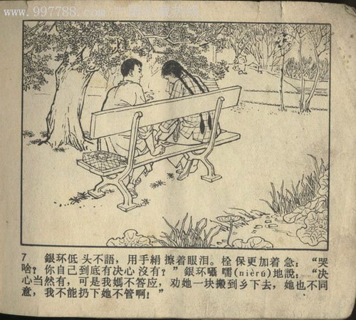 另一个个人化的渊源就是连环画了。《朝阳沟》的连环画有三位著名的大家画过,一个是贺友直,一个是刘继卣,还有一个是现在在国画上很有成就的天津画家杜滋龄。三个人的作品都源于豫剧《朝阳沟》,都格外地特点鲜明,画趣盎然,成了连环画史上的标志性作品。在中国美术馆新中国60周年美术作品回顾展的厅堂之上,连环画部分,展出了贺友直的原稿,正是《朝阳沟》中的很著名的几页。贺友直在连环画创作中一向强调的“四小”:小孩子、小动物、小道具、小动作,在这几幅画里都有详细生动的体现,尤其是女人们勾肩搭背地去看新媳妇的那一页,很典型地表现了贺友直的风格。在源于生活,源于对生活的细致而有兴趣的观察这一点上,连环画《朝阳沟》的作者贺友直与豫剧《朝阳沟》的作者杨兰春,不谋而合。