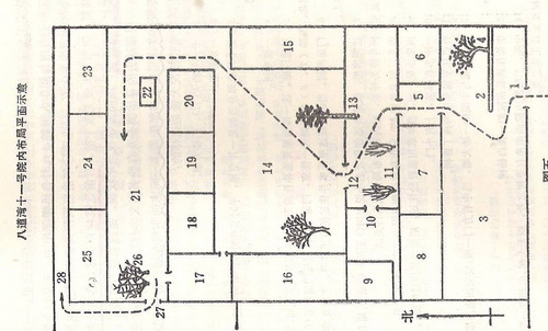 十一号的生活有日式的一面,四合院里有单独的澡堂,并不多见。后来周作人死在这间澡堂,这院里有冥冥之气。大前年晚春的一天下午与止庵先生访十一号,还专门想确认一下澡堂的位置。八道湾十一号我见有两张平面示意图,一张是孙瑛绘制的,院内每间房屋是谁使用的,皆有考订,可信度很高,因为她亲访过周作人、钱稻荪等老人。朱安住室的地位还是最好的(图中20即朱安住室),中院的正房颇为高壮,磨砖对缝,是四合院建筑中级别较高的一种。我多次抚摸它的山墙,想象大院里的恩恩怨怨。
