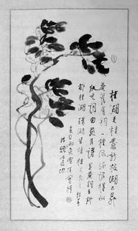 大约是1996年春节过后的一天晚上,张锲同志来电话相约去看望汪老。那时我已经调到中国作协来工作,因为俗务忙碌,也的确很久没有看望他了。听说他搬了家,且曾对北京作协的朋友“骂”我:“建功这家伙,忙什么呢,这么久没跟我联络了!”汪老的家搬到了虎坊桥附近,即他儿子所在单位的家属房里。既是出谷乔迁,是不能不参观一下的。没想到张锲和我随着汪老看他的新居时,还有几位陪同前来的年轻同志发现了宝贝――他们从汪老的字纸篓里找出了几团宣纸,抹平,如获至宝地跑过来道:“汪老!您画废了的,我们可要了!”汪老还是一如往常的神态,先是很平和地瞟去一眼,随即粲然地笑起来,说:“哎呀,都是烂纸,你们真能翻!”他不再说什么,走到画案前,从一个角落里掏出一卷纸来――大概都是他近期的画作。年轻人有足够的机敏,他们竟欢呼起来,一张一张展看时,这个说:“汪老,我要这张!”那个说:“这张是我的!”我这才恍然大悟,原来汪老是让我们挑画。张锲乐呵呵地说:“你们这哪是挑画?你们这是抢画来啦!”嘻嘻哈哈中,每人各执所爱,请汪老一一题签。我选中的,是《升庵桂花图》――虬曲而上的枝条顶部,盛开着黄灿灿的桂花。环绕画面者,是汪老的题诗:“桂湖老桂发新枝,湖上升庵旧有祠。一种风流谁得似,状元词曲罪臣诗。”诗后加注曰:“升庵祠在新都桂湖 环湖皆植桂 1996年新春 是日雨夹雪 持赠建功 汪曾祺”。四川新都的桂湖公园,我是去过的。这里是明代杨慎(升庵)的故居旧址。杨升庵于明正德间高中状元,授翰林修撰。嘉靖时因“议大礼”而罹祸,谪戍云南永昌,流放终生。据说,现新都桂湖,“环湖皆植”之桂,即为当年升庵所植也。八月时节,桂花盛开,香气袭人。品画赏诗,当时便与汪老相约,何时随他新都重游?汪老莞尔一笑,说:“你太忙。”