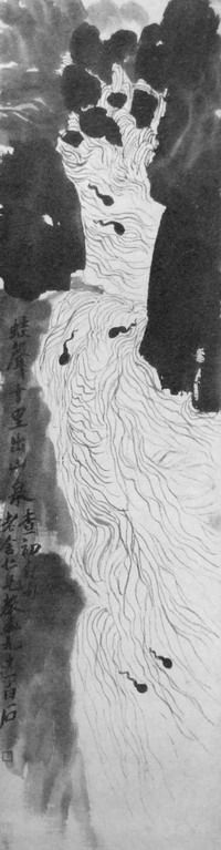 | 1952年,齐白石根据老舍命题所画的《蛙声十里出山泉》 |
