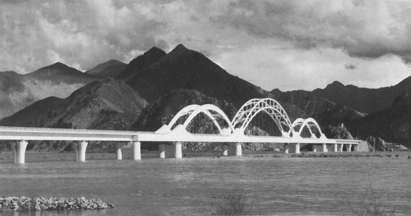 青藏铁路的标志性工程――拉萨河特大桥。三个主拱象征三条洁白的哈达,整座大桥和布达拉宫遥遥相望。