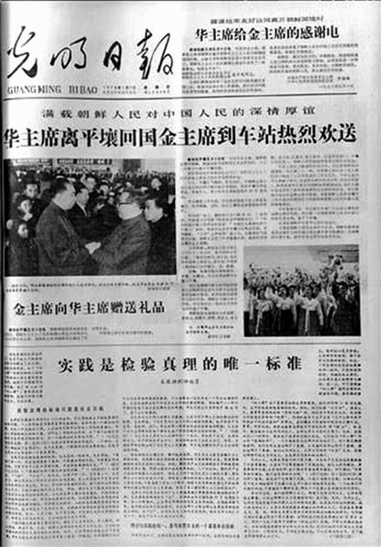 5月10日,《实》文在《理论动态》上如期刊出了,杨西光心中热潮滚滚,心情激动。他当即连续拨打电话,与曾涛、胡绩伟、华楠等人联系,共同部署全面出击的整体作战方案。5月11日,也就是《理论动态》刊出的第二天,《光明日报》即以“本报特约评论员”的名义,在一版重要位置上,用通栏标题发表。原来,是准备放在一版上辟栏的,因为当天有华国锋访朝回国的消息,此文只能放在下辟栏了。