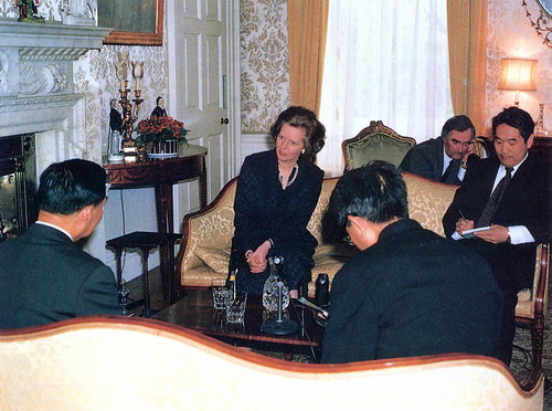 一九八四年光明日报驻伦敦记者许世铨和其他中国记者在英国伦敦唐宁街10号首相府采访英国首相撒切尔夫人。