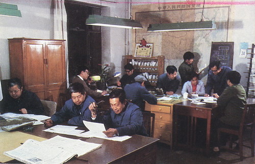 光明日报夜班编辑在设计第二天报纸版面,研究稿件和标题。