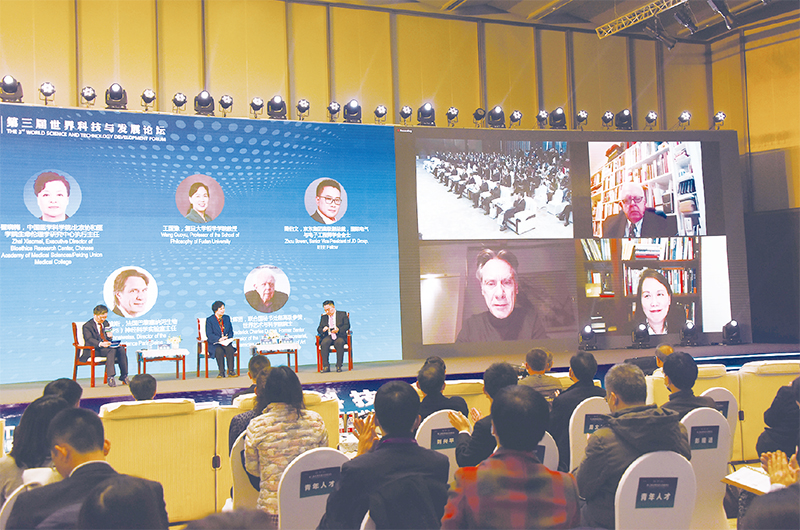 2021年11月6—7日,第三届世界科技与发展论坛在京举办。论坛以“开放·信任·合作”为主题,探讨全球科技创新、科技治理与科学文化,增进全球科技共同体互信合作,促进经济社会的可持续健康发展。图为中外专家线上线下围绕“科技伦理治理与信任合作”进行高端对话。 中新社发孙自法/摄