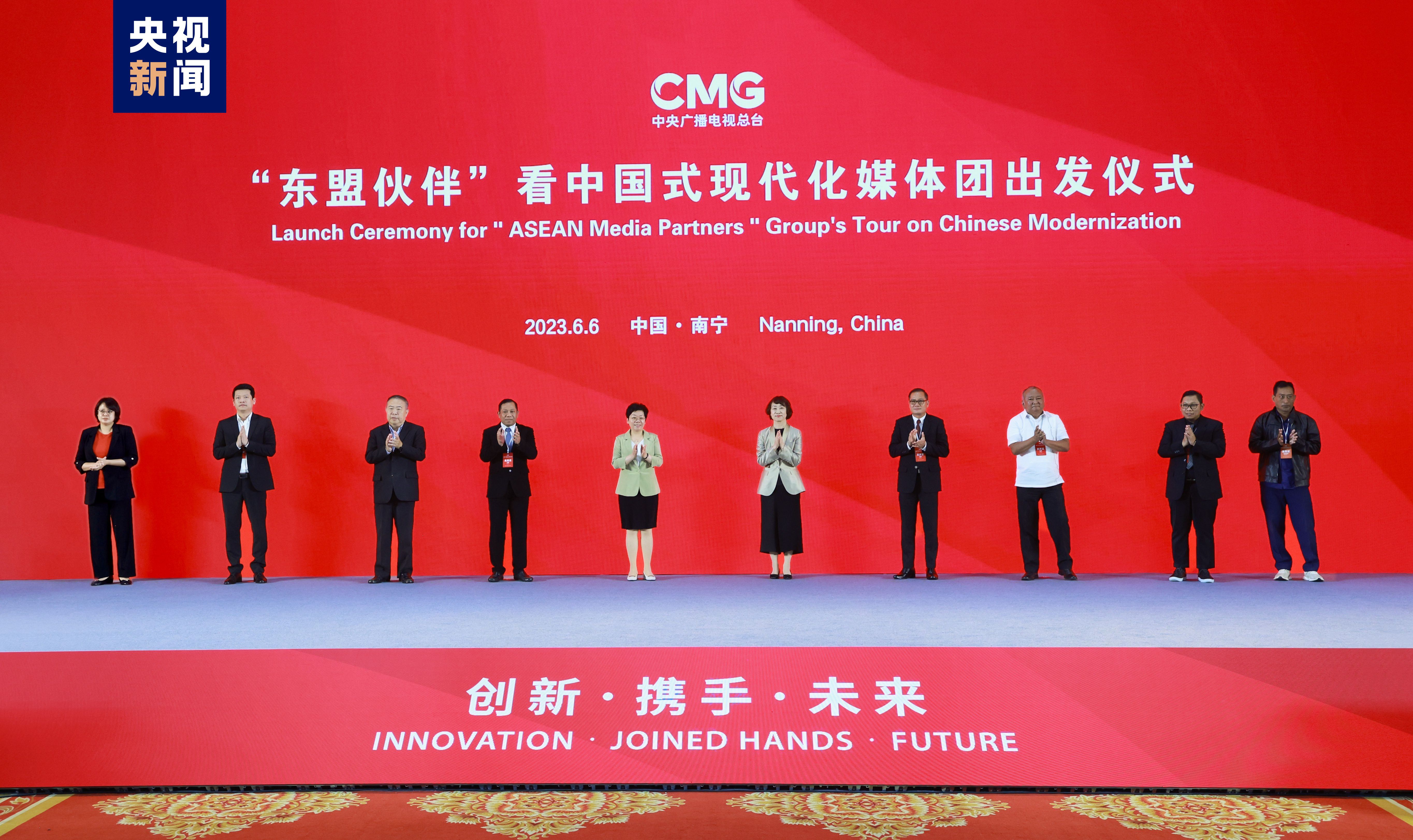△中央广播电视总台副台长邢博,广西壮族自治区党委常委、宣传部部长陈奕君,老挝巴特寮通讯社社长坎培·披拉帕,缅甸国家广播电视台台长耶乃,菲律宾国家电视台董事会副主席宾胡·巴尼科徳,泰国NATION集团高级顾问、原总裁阿迪萨,印尼艾尔辛达电台总编辑哈尔约·利斯塔马季,越南数字电视台联系合作中心主任陈玉秀,柬埔寨国家电视台办公厅主任昆皮罗,马来西亚国家新闻社代表郑美清共同启动“东盟伙伴”看中国式现代化媒体团
