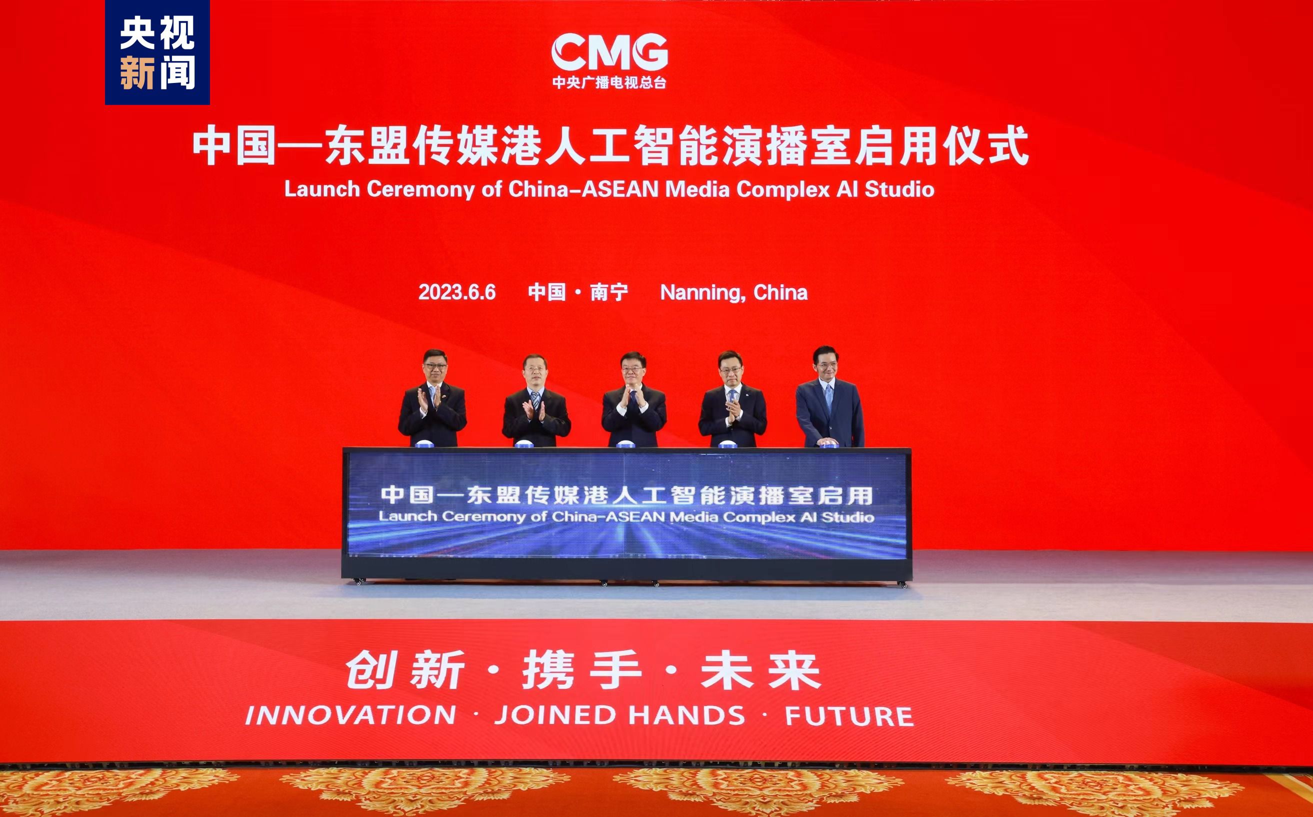 △广西壮族自治区政府副主席苗庆旺、中央广播电视总台总编室主任梁建增、中国仪器进出口集团有限公司董事长汪晓、缅甸联邦共和国驻南宁总领事馆总领事觉梭登、越南社会主义共和国驻南宁总领事馆总领事杜南忠共同启动中国—东盟传媒港人工智能演播室